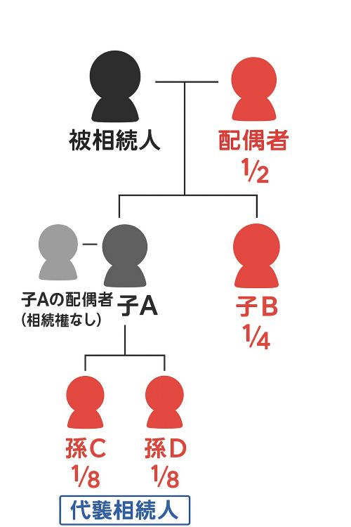 • 子Aの代わりに、孫C・孫Dがそれぞれ1/8ずつ相続する。